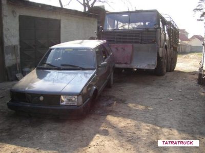 Tatra 813 kolos s radlicou v správnej výke hrnie pred sebou Fiat Regata