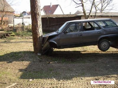 Kolos ohromnou silou tlačí fiat na strom.