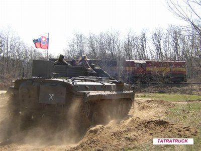 BVP kontra lokomotiva v pozadí.